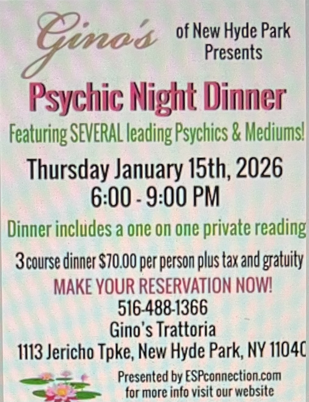 January 15 @ 6:00 pm - 9:00 pm Gino’s Trattoria Gino's Trattoria - NHP 1113 Jericho Turnpike, New Hyde Park, United States