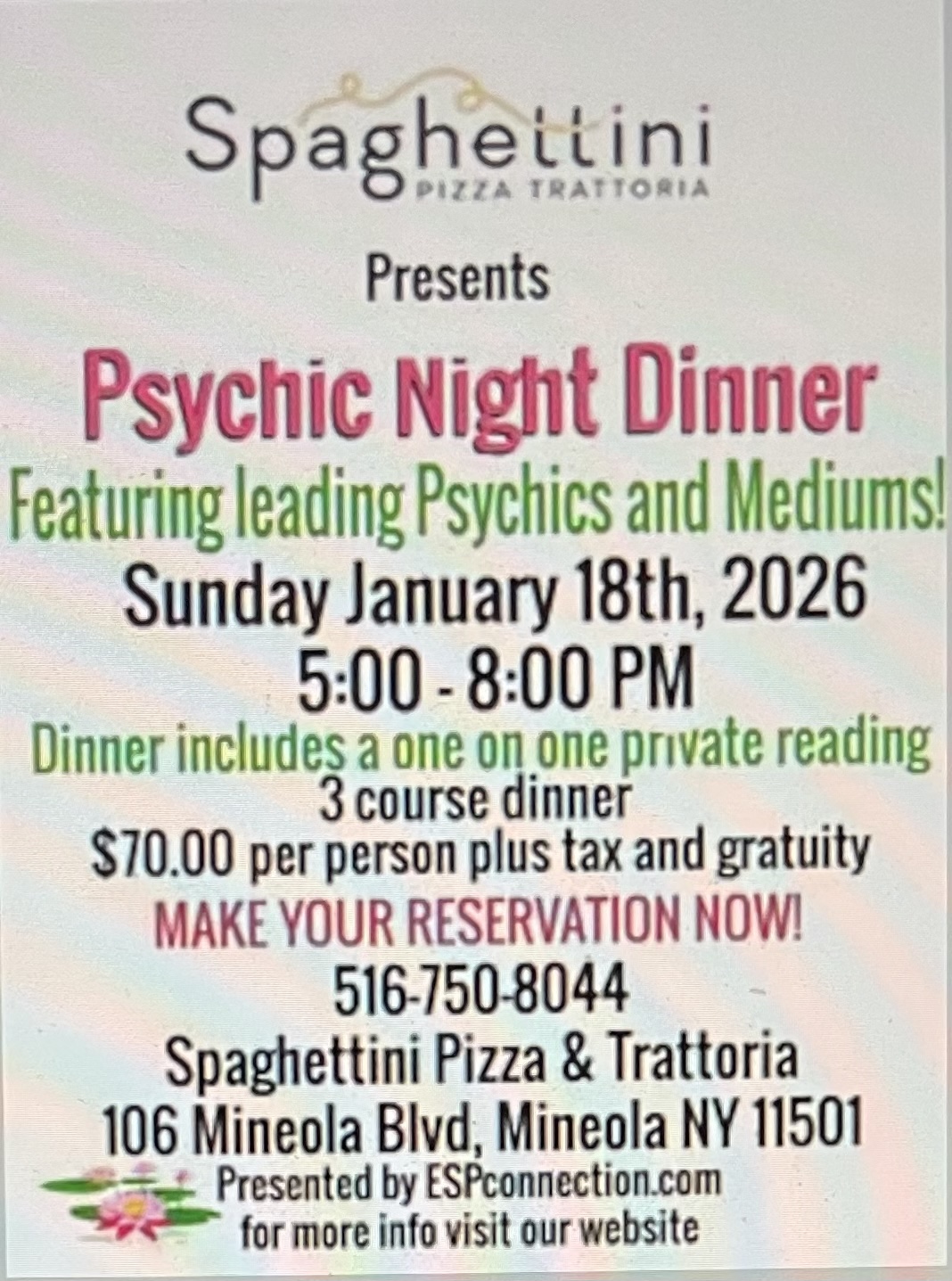 January 18 @ 6:00 pm - 9:00 pm Spaghettini Pizza * Trattoria Speghettini 106 Mineola Blvd, Mineola, NY, United States