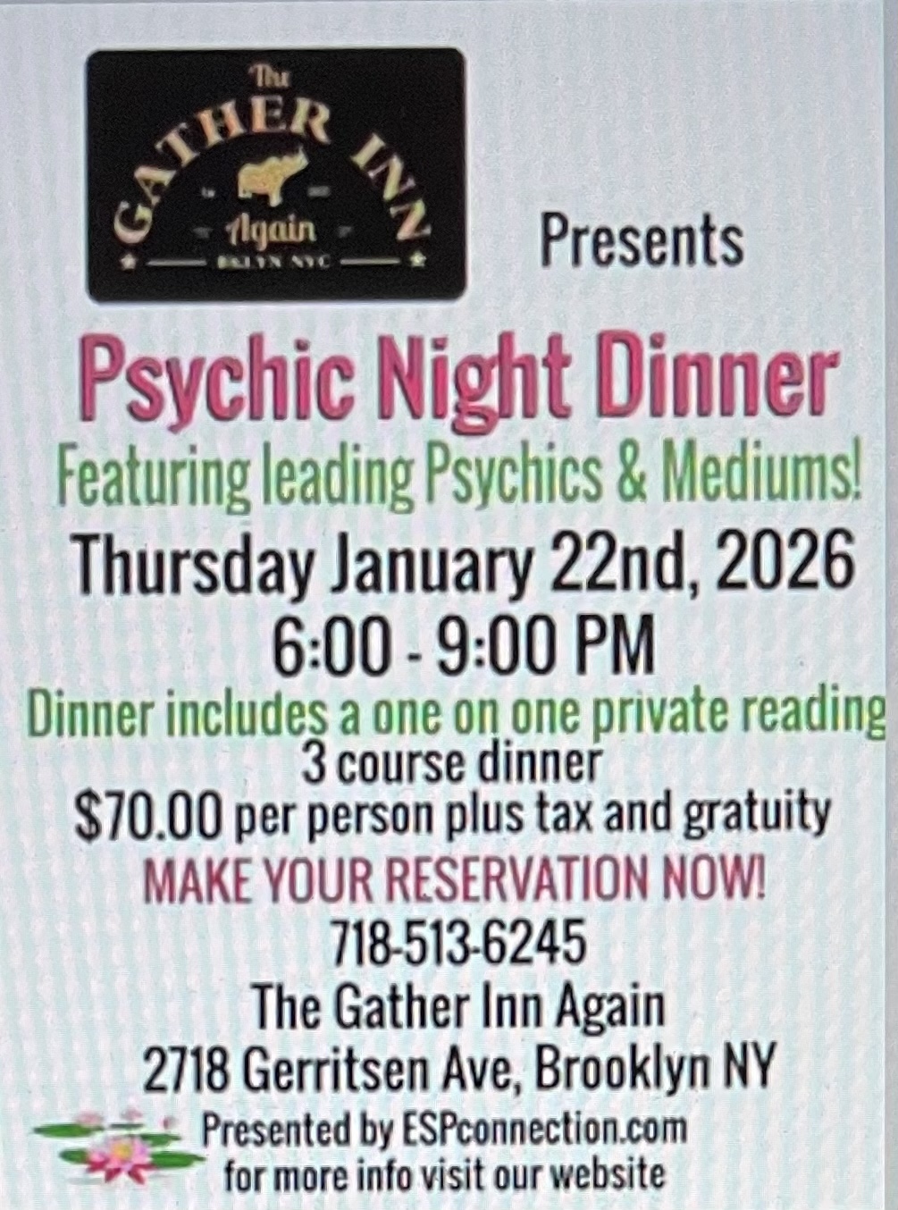 January 22 @ 6:00 pm - 9:00 pm The Gather Inn Again The Gather Inn Again - Brooklyn 2718 Gerritsen Avenue, Brooklyn, NY, United States