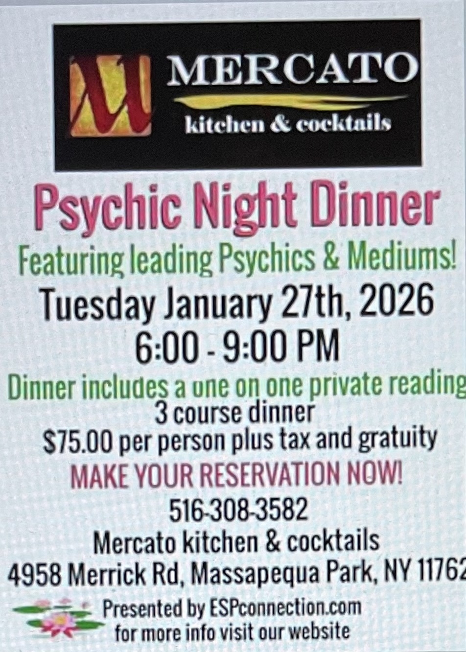 January 27 @ 6:00 pm - 9:00 pm Mercato Kitchen Mercato Kitchen - Massapequa Park 4958 Merrick Rd, Massapequa Park, NY, United States