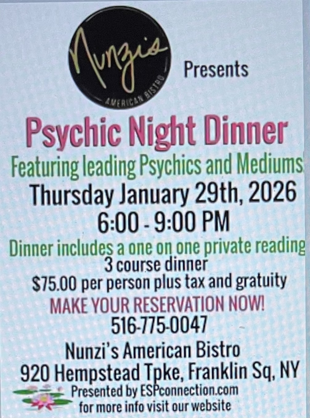 January 29 @ 6:00 pm - 9:00 pm Nunzi Nunzi's American Bistro - Franklin Square 920 Hempstead Tpke, Franklin Square, NY, United States